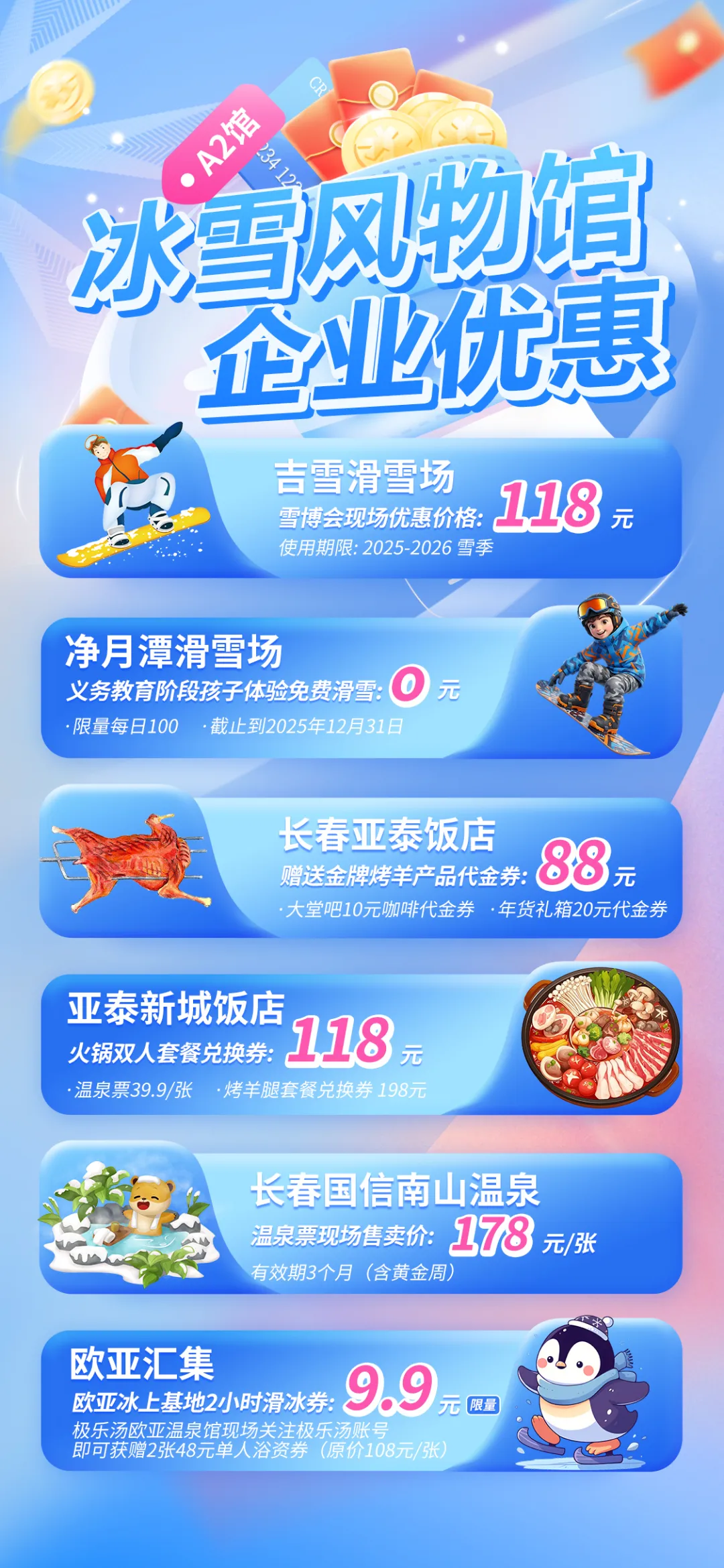 划重点强调! 到雪博会现场领取消费券购买冰雪装备(雪板等)及展会产品等可享6.5折优惠,每单最高减免350元。雪博会期间每人可领5次,可以一天内用完,也可在会期内用完。